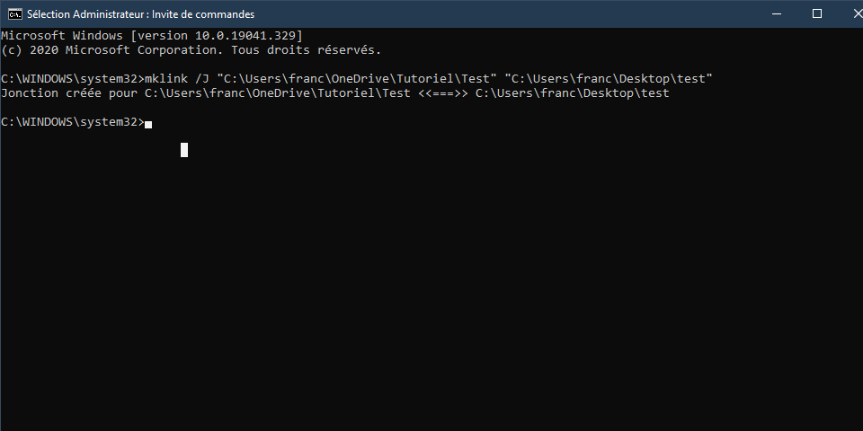 La commande ci-dessus permet de lier sur votre "OneDrive" un dossier contenant vos fichier, il vous faut remplacer le "%UserProfile%\OneDrive\DossierdeDestination" par le chemin où est installer Onedrive, ainsi que le chemin du "D:\DossierSource" d'ou provient votre dossier.