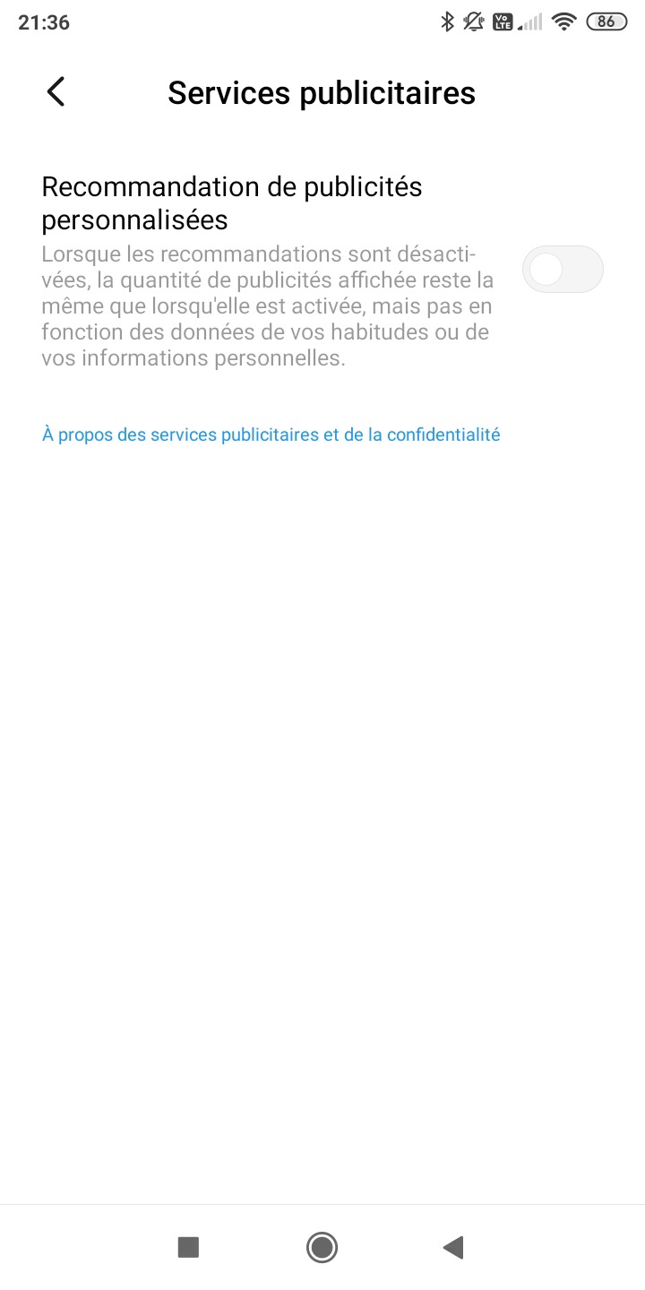 Il suffit ensuite de redémarrez votre smartphone. Normalement vous devriez déjà avoir la majorité des pubs qui ne s’affiche plus. Maintenant il faut désactiver les recommandations publicitaires personnalisées.